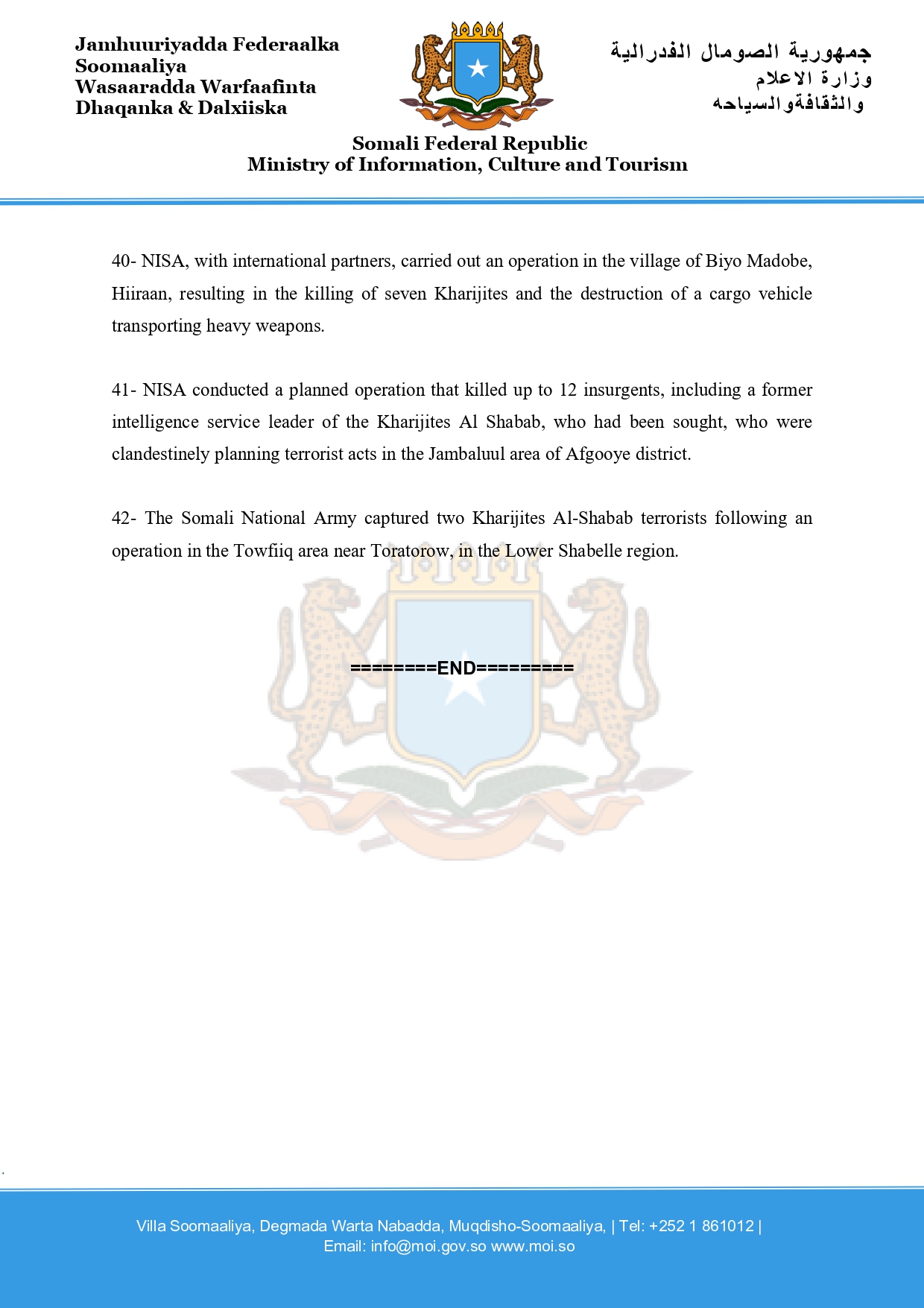 41- NISA conducted a planned operation that killed up to 12 insurgents, including a former intelligence service leader of the Kharijites Al Shabab, who had been sought, who were clandestinely planning terrorist acts in the Jambaluul area of Afgooye district.