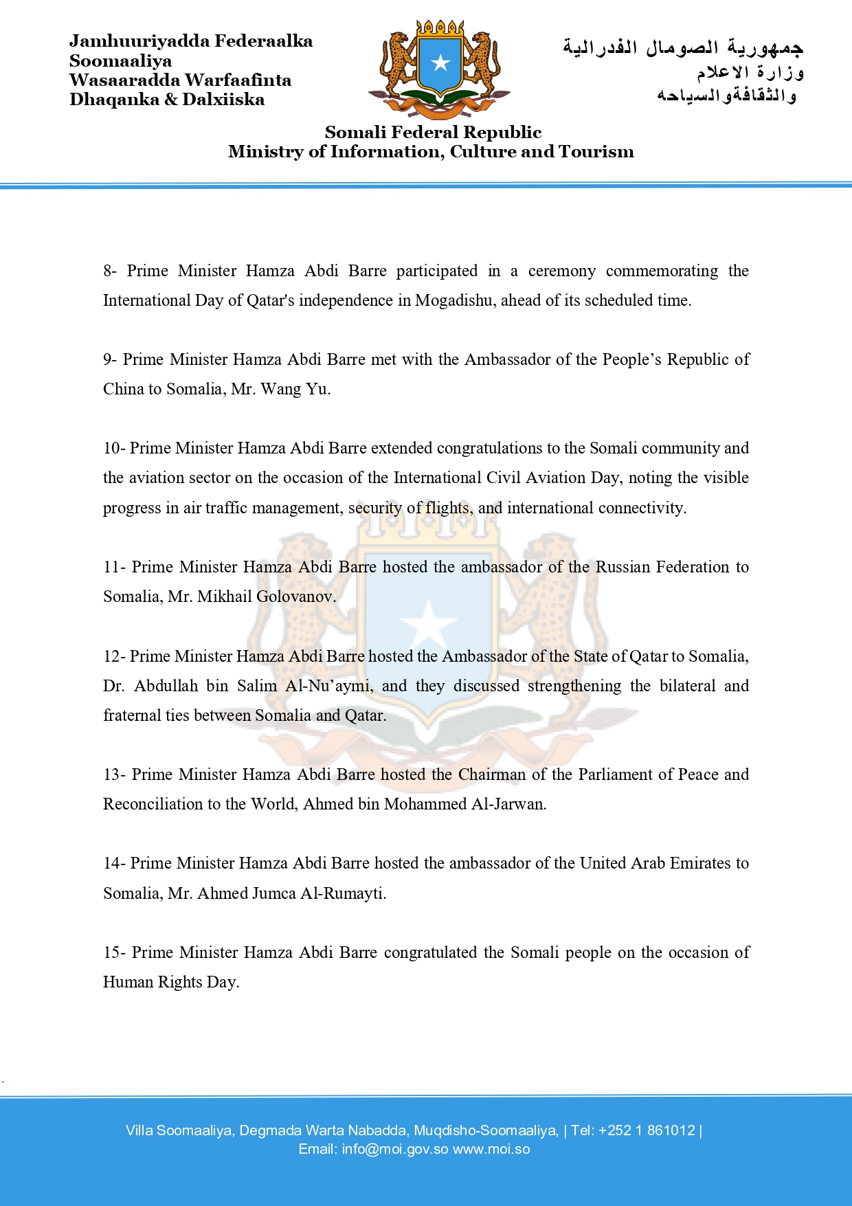 8- Prime Minister Hamza Abdi Barre participated in a ceremony commemorating the International Day of Qatar’s independence in Mogadishu, ahead of its scheduled time.