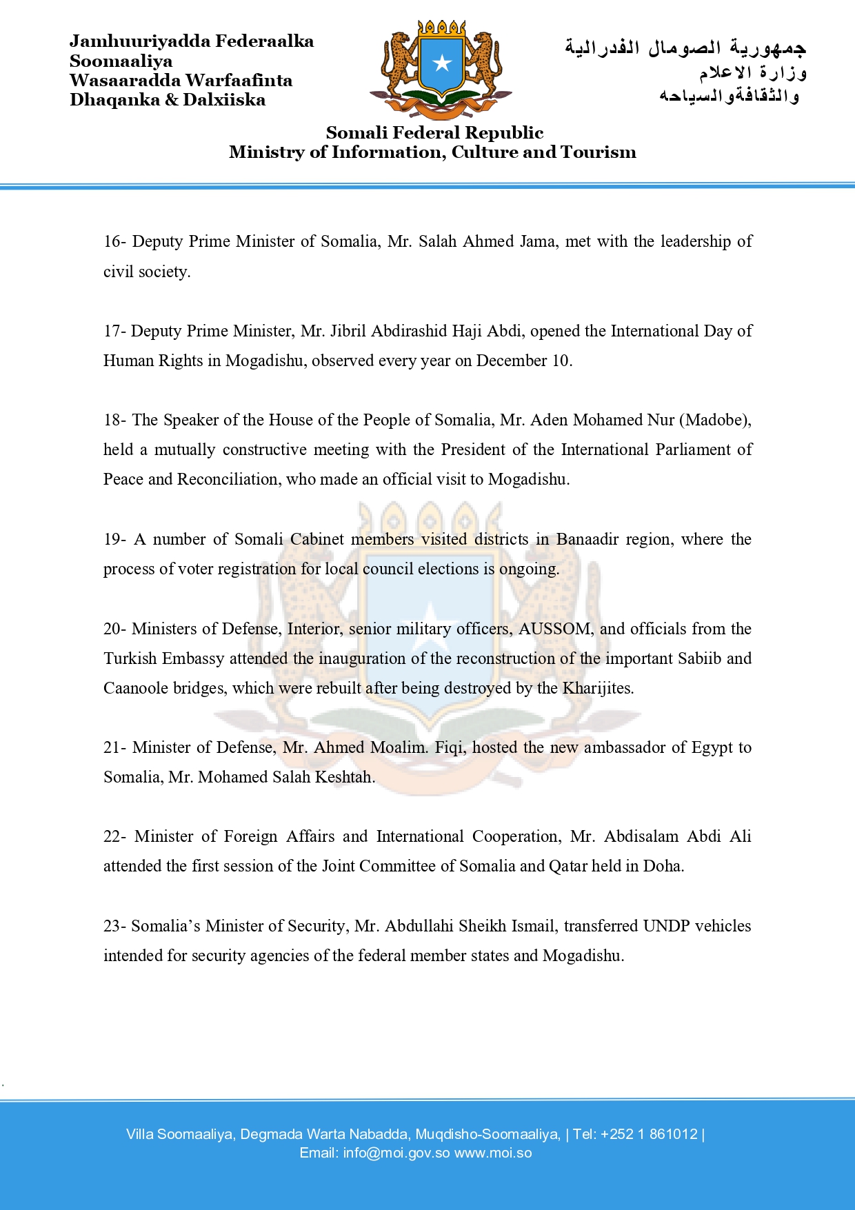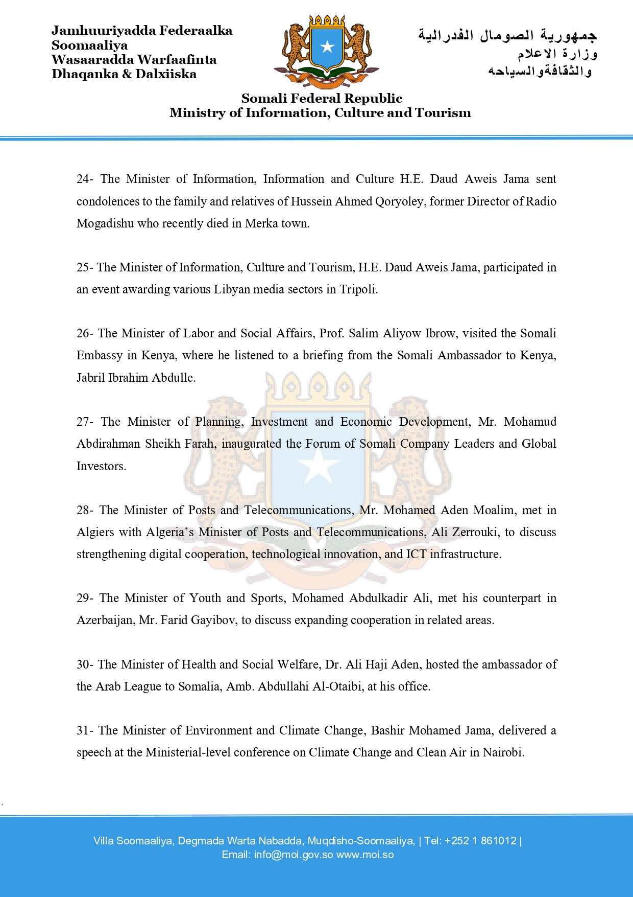 24- The Minister of Information, Information and Culture H.E. Daud Aweis Jama sent condolences to the family and relatives of Hussein Ahmed Qoryoley, former Director of Radio Mogadishu who recently died in Merka town.