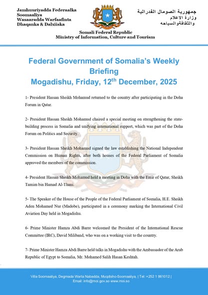 Federal Government of Somalia’s Weekly Briefing Mogadishu, Friday, 12th December, 2025