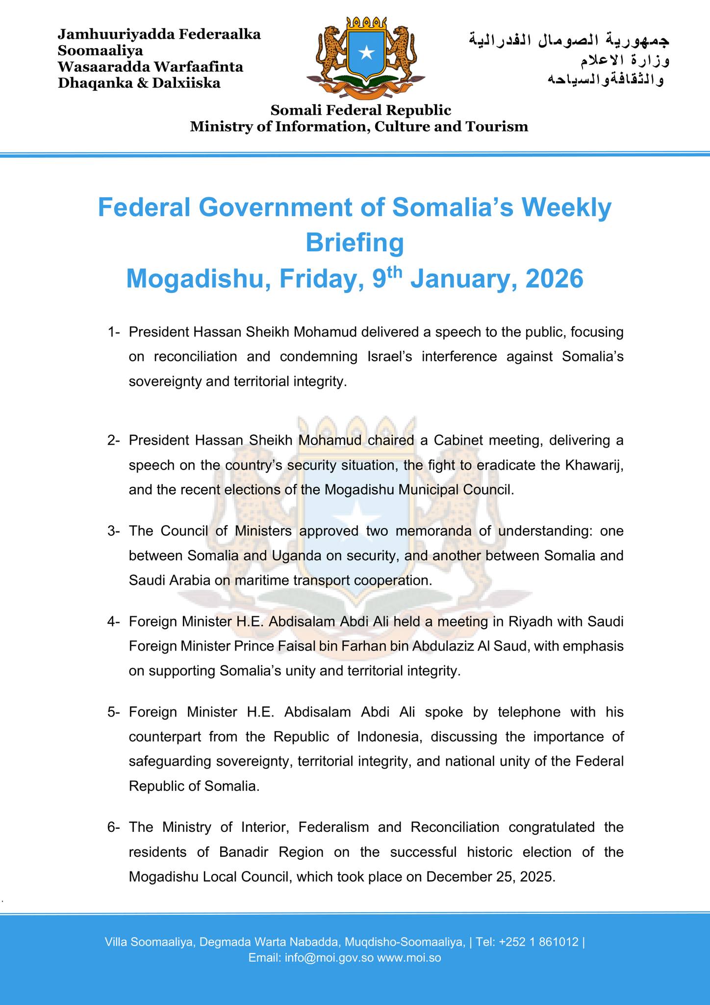 6- The Ministry of Interior, Federalism and Reconciliation congratulated the residents of Banadir Region on the successful historic election of the Mogadishu Local Council, which took place on December 25, 2025.