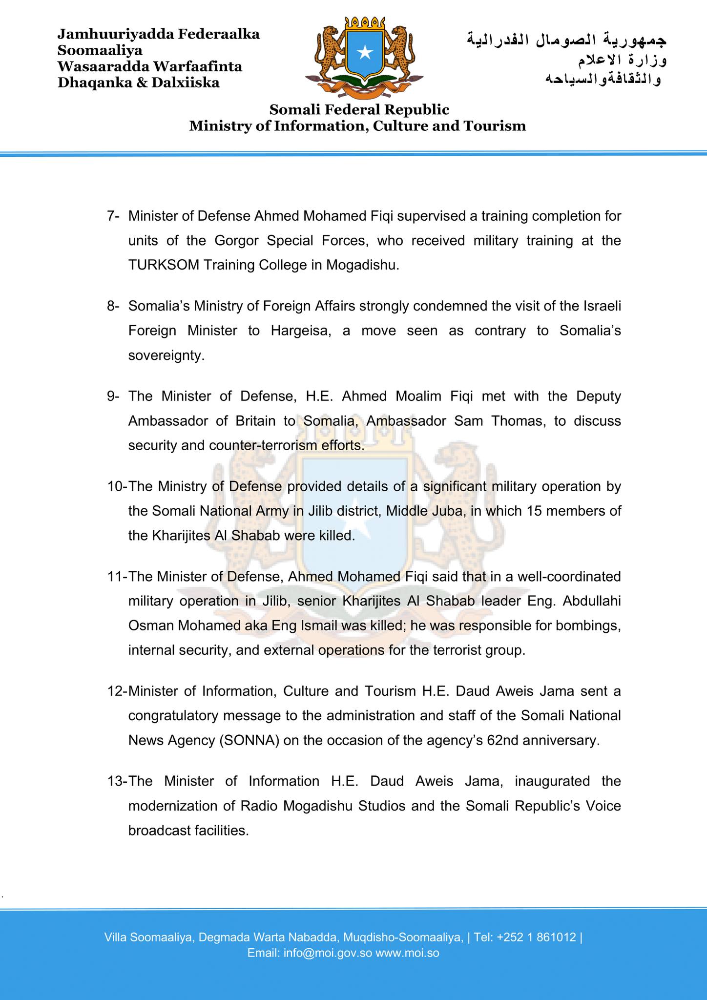 11- The Minister of Defense, Ahmed Mohamed Fiqi said that in a well-coordinated military operation in Jilib, senior Kharijites Al Shabab leader Eng. Abdullahi Osman Mohamed aka Eng Ismail was killed; he was responsible for bombings, internal security, and external operations for the terrorist group.