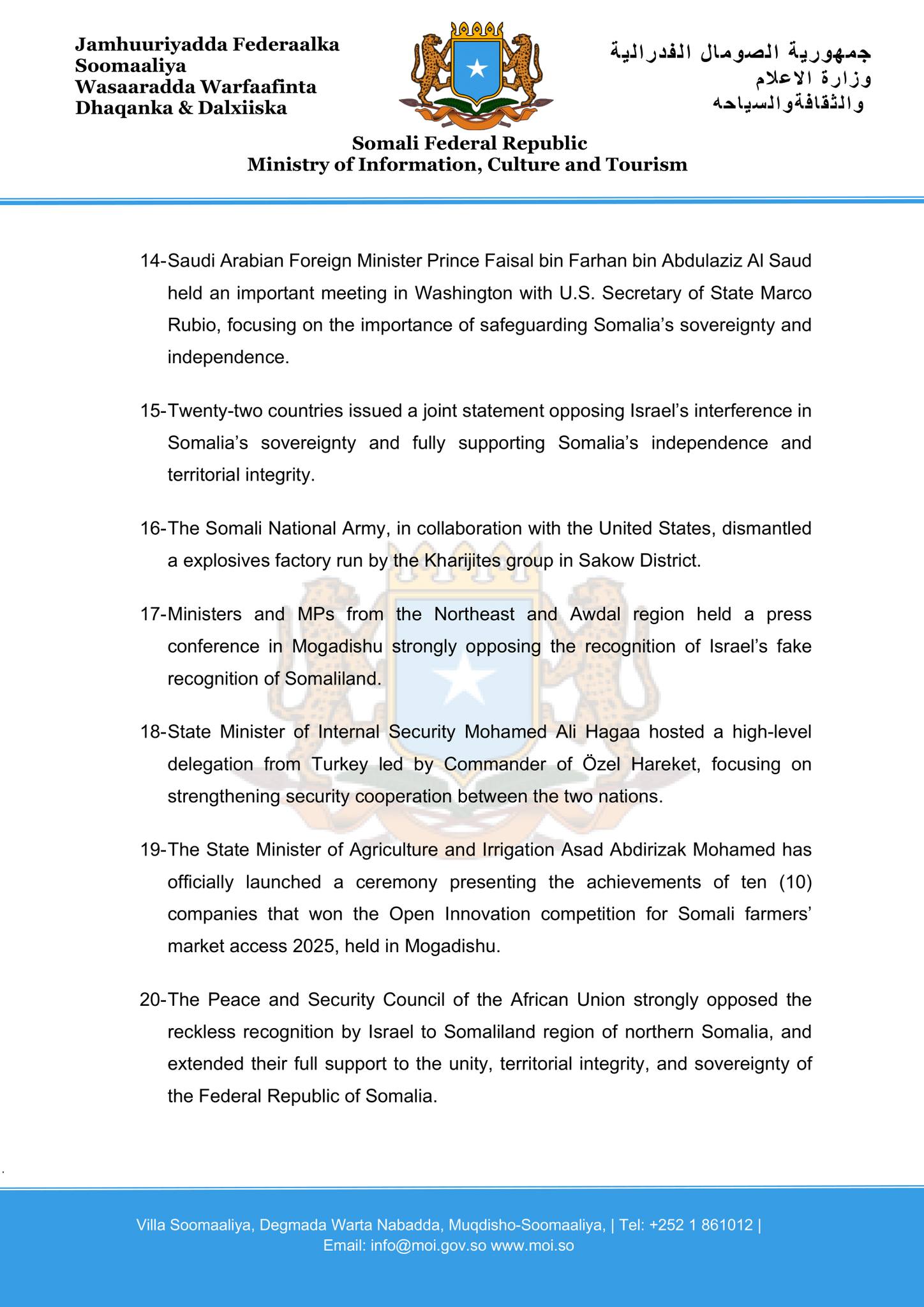 14- Saudi Arabian Foreign Minister Prince Faisal bin Farhan bin Abdulaziz Al Saud held an important meeting in Washington with U.S. Secretary of State Marco Rubio, focusing on the importance of safeguarding Somalia’s sovereignty and independence.