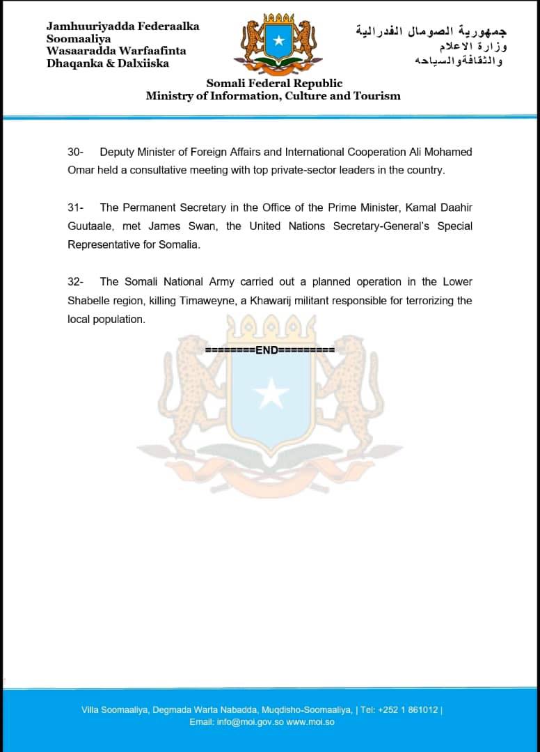 32- The Somali National Army carried out a planned operation in the Lower Shabelle region, killing Timaweyne, a Khawarij militant responsible for terrorizing the local population.
