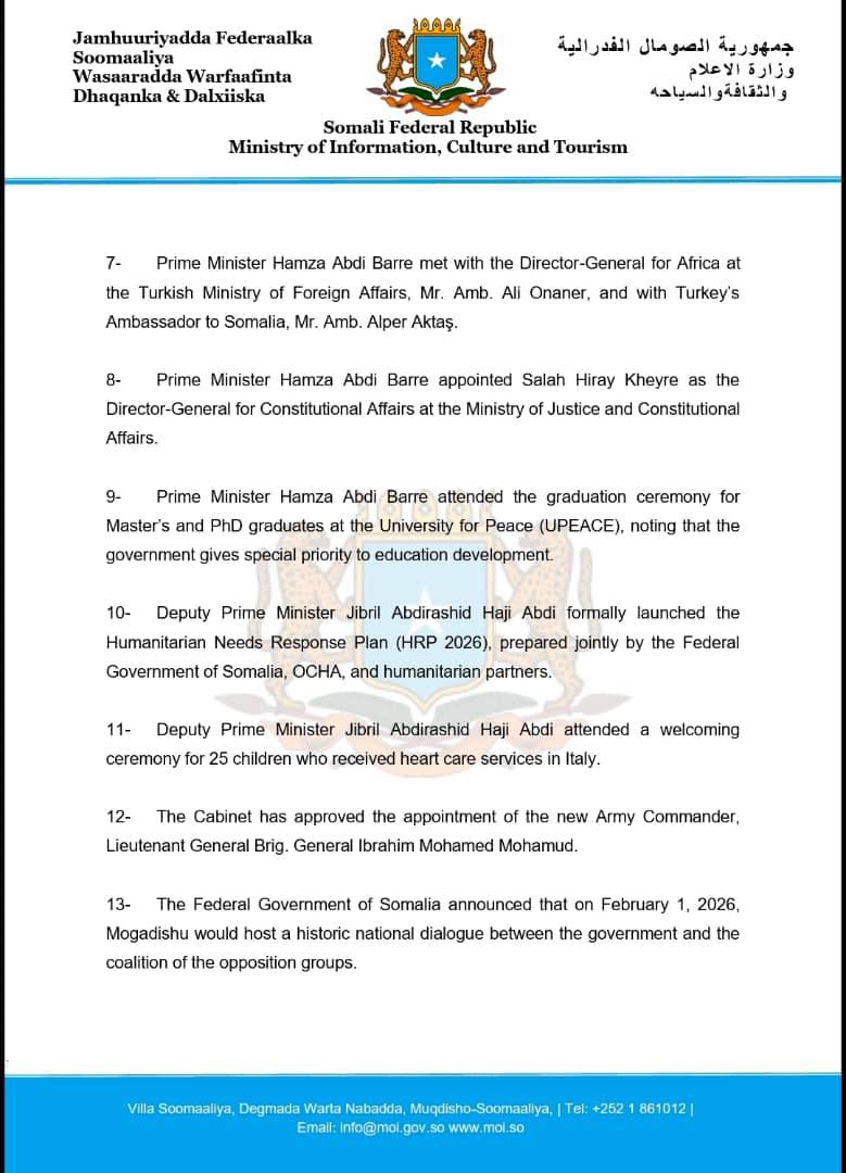 13- The Federal Government of Somalia announced that on February 1, 2026, Mogadishu would host a historic national dialogue between the government and the coalition of the opposition groups.