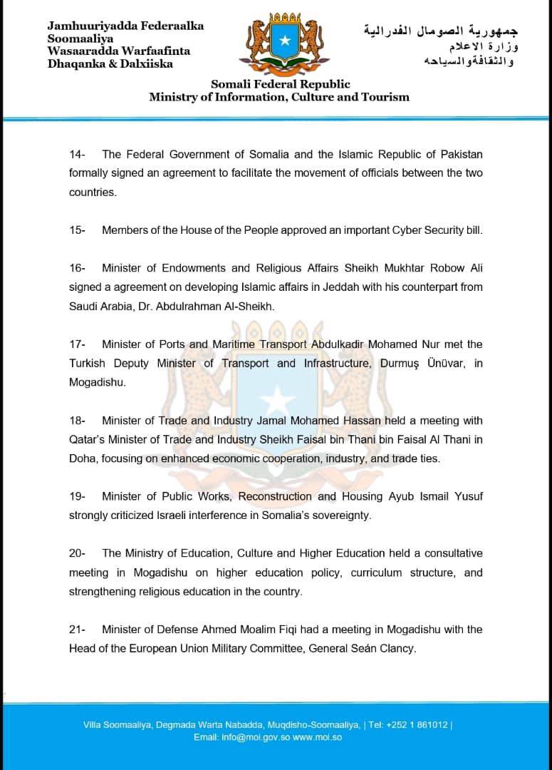 14- The Federal Government of Somalia and the Islamic Republic of Pakistan formally signed an agreement to facilitate the movement of officials between the two countries.