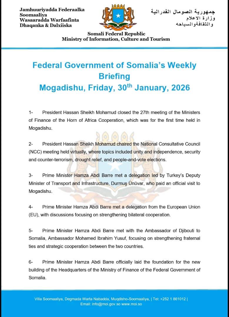 10- Deputy Prime Minister Jibril Abdirashid Haji Abdi formally launched the Humanitarian Needs Response Plan (HRP 2026), prepared jointly by the Federal Government of Somalia, OCHA, and humanitarian partners.