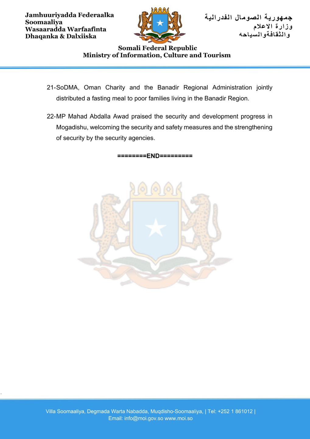 22- MP Mahad Abdalla Awad praised the security and development progress in Mogadishu, welcoming the security and safety measures and the strengthening of security by the security agencies.