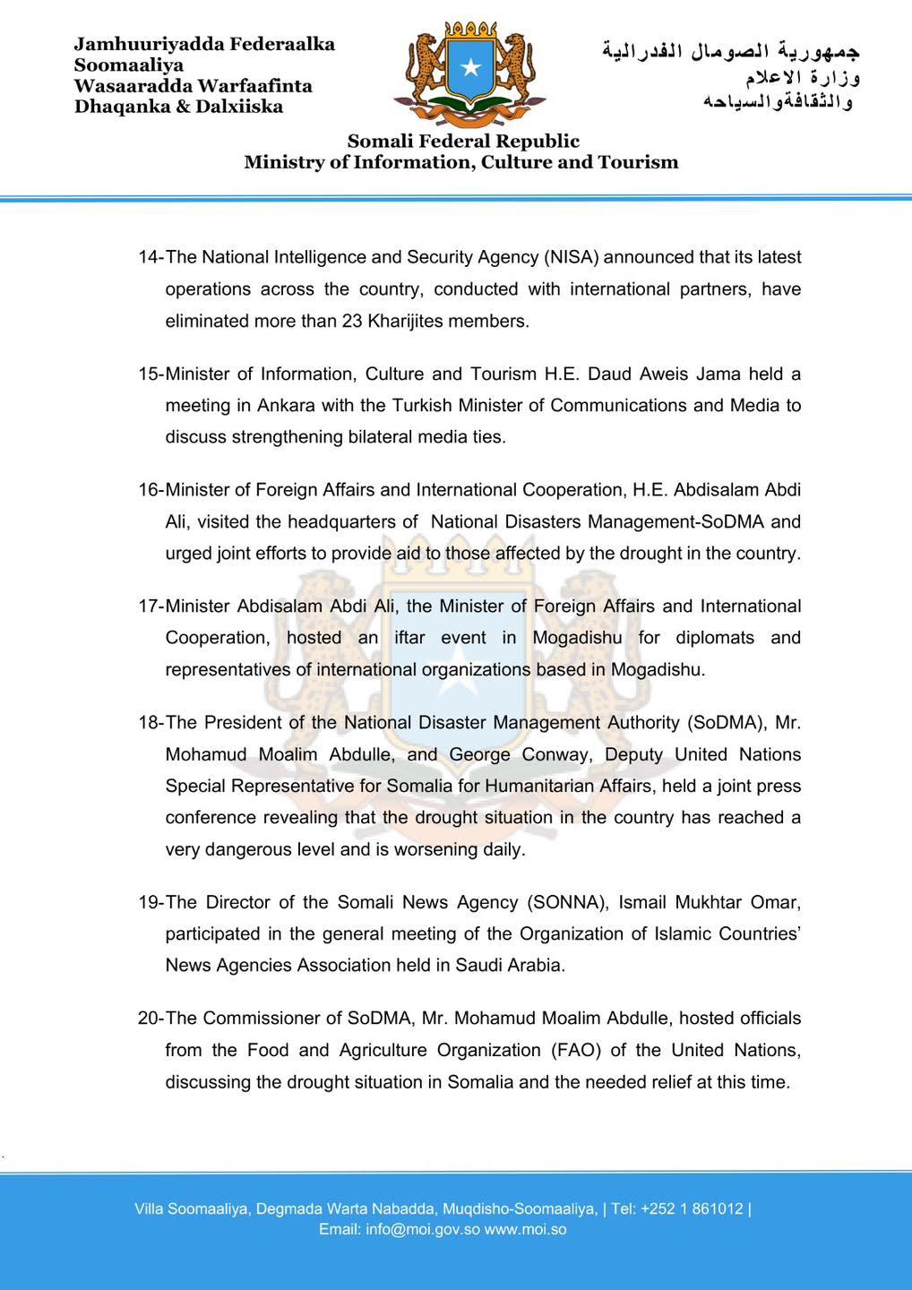 19- The Director of the Somali News Agency (SONNA), Ismail Mukhtar Omar, participated in the general meeting of the Organization of Islamic Countries’ News Agencies Association held in Saudi Arabia.