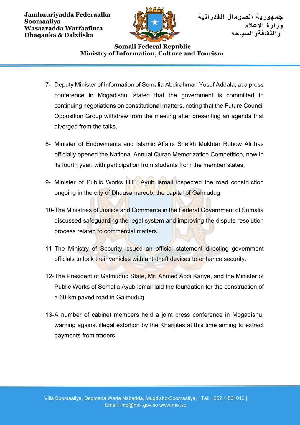 7- Deputy Minister of Information of Somalia Abdirahman Yusuf Addala, at a press conference in Mogadishu, stated that the government is committed to continuing negotiations on constitutional matters, noting that the Future Council Opposition Group withdrew from the meeting after presenting an agenda that diverged from the talks.