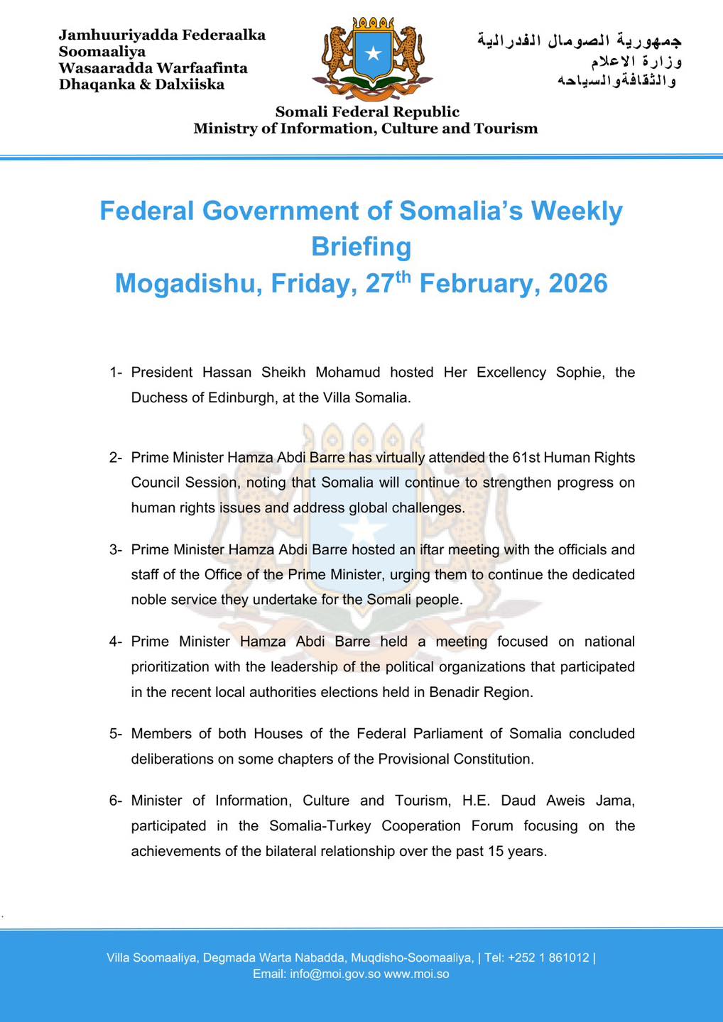 2- Prime Minister Hamza Abdi Barre has virtually attended the 61st Human Rights Council Session, noting that Somalia will continue to strengthen progress on human rights issues and address global challenges.