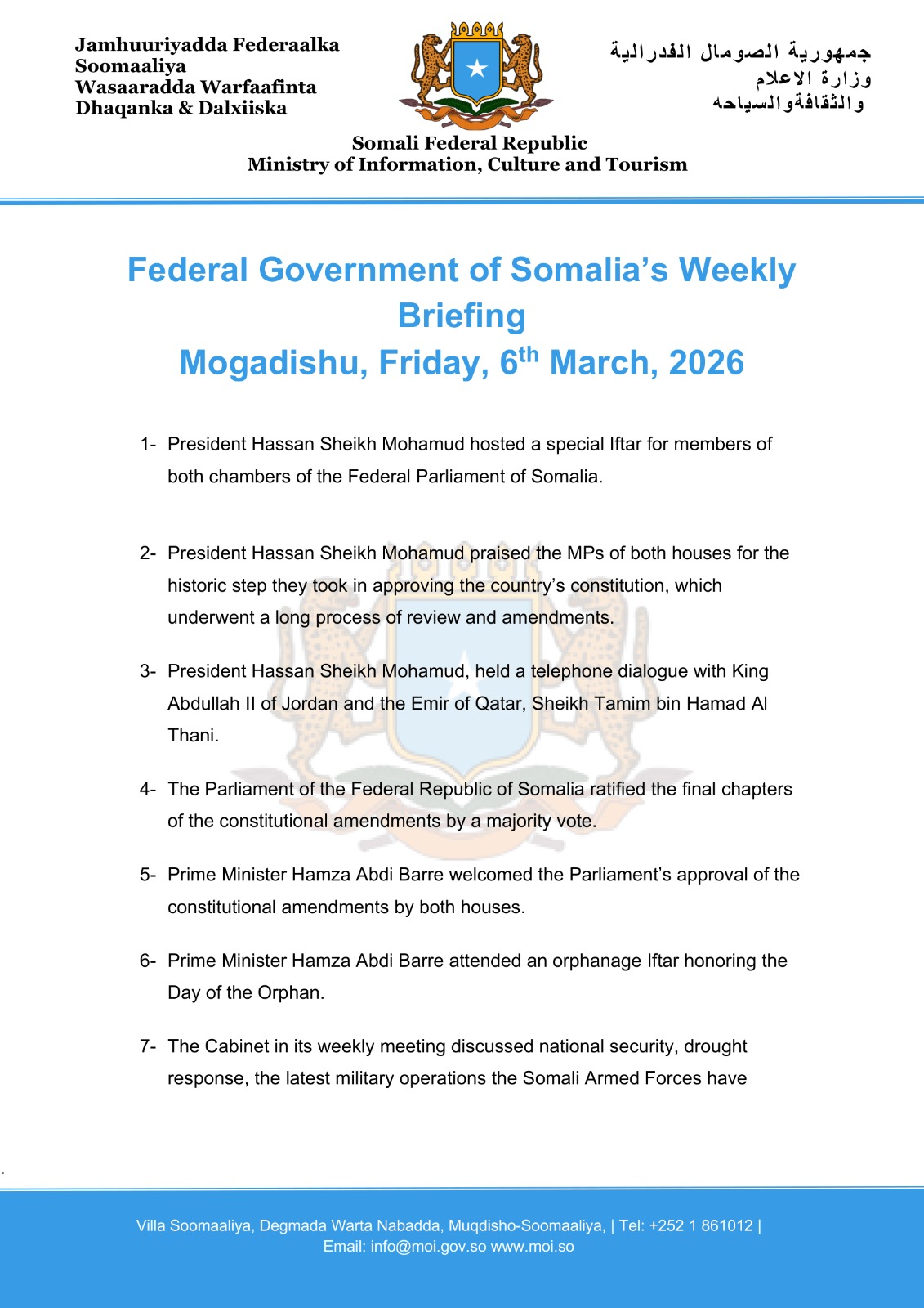 Federal Government of Somalia’s Weekly Briefing Mogadishu, Friday, 6th March, 2026