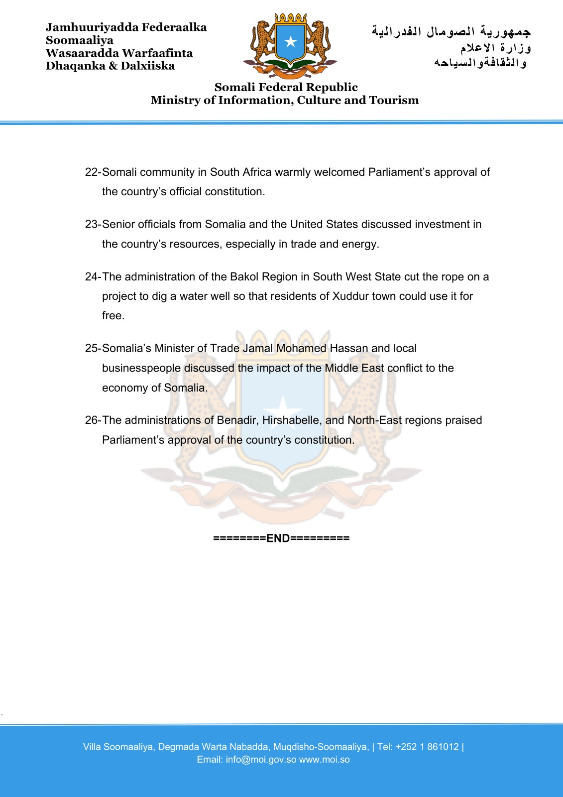 10- Minister of Information, Culture and Tourism H.E. Daud Aweis Jama has called the completion of the constitution a historic milestone and stated that the Federal Government of Somalia is ready to strengthen public awareness of the constitution and statehood.